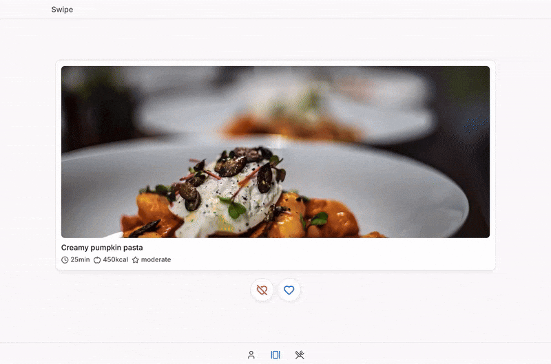 Een swipe-based recepten app, die je helpt met het kiezen van wat je vanavond kookt. Gebouwd in Vue & Supabase.